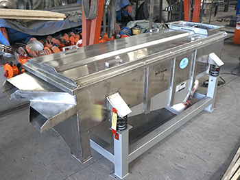 直線篩依靠?jī)蓚€(gè)相同頻率的反向電機(jī)使物料在篩面上直線向前跳躍,小于篩孔孔徑的物料通過篩網(wǎng)落入下層,將原本雜亂無章的顆粒分離,即按粒度分層,形成底部小顆粒、頂部粗顆粒的排列,從而達(dá)到對(duì)物料進(jìn)行篩分和分級(jí)的目的
